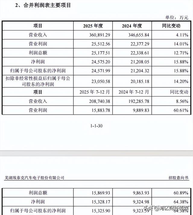 招股意向书显示,经审计机构审阅,埃泰克2025年全年的营业收入为36.09亿元,同比增长4.11%;归母净利润为2.46亿元,同比增长15.88%。