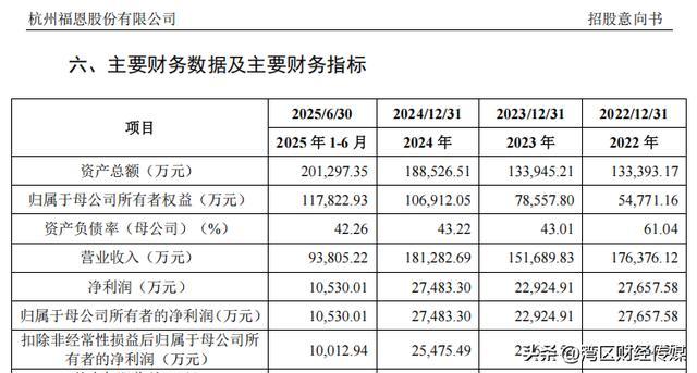 2022年至2024年及2025年上半年,福恩股份的营业收入分别为17.64亿元、15.17亿元、18.13亿元及9.38亿元,归母净利润分别为2.77亿元、2.29亿元、2.75亿元及1.05亿元。