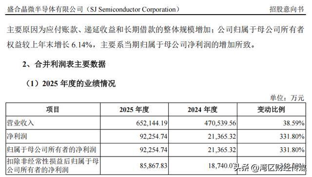 招股意向书显示,经审计机构审阅,盛合晶微受益于所处行业市场需求快速增长、产品结构持续优化等因素,2025年全年的营业收入为65.21亿元,同比增长38.59%;归母净利润为9.23亿元,同比增长331.80%。