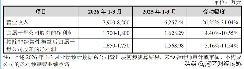 招股说明书显示,恒道科技预计其2026年第一季度的营业收入为7900万元至8200万元,同比增长26.25%至31.04%;归母净利润为1700万元至1800万元,同比增长4.40%至10.55%。